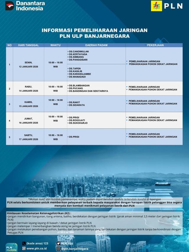 Selain menginformasikan tentang pemadaman listrik, PLN Kebumen juga memberikan imbauan. Pertama, agar masyarakat tidak mendirikan bangunan, tiang bendera, atau baliho dekat dengan jaringan listrik. Jarak aman bangunan dari jaringan listrik adalah 3 meter.