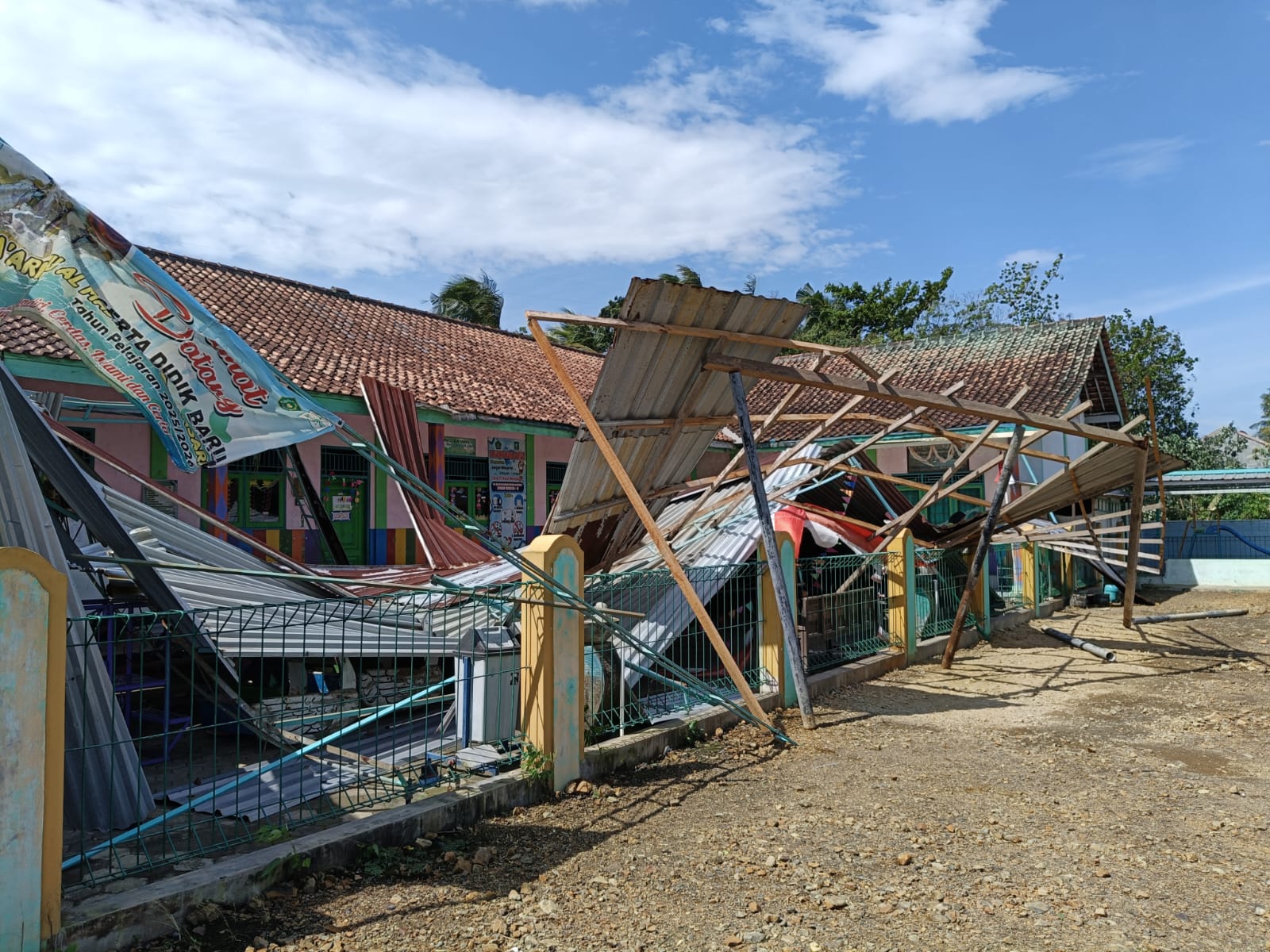 Tak hanya rumah warga, fasilitas pendidikan juga terdampak. Garasi TK Ma’arif NU Al Madina 02 Gentasari dilaporkan ambruk dengan perkiraan kerugian mencapai Rp 15 juta.