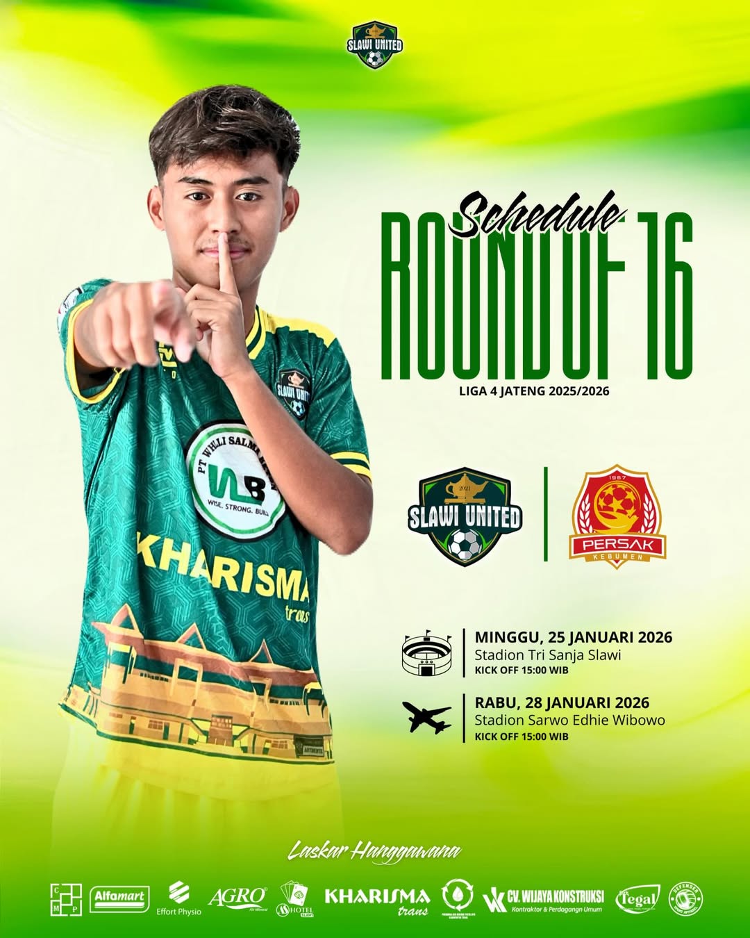 SERAYUNEWS-Salah satu pertandingan babak 16 besar Liga 4 Jateng adalah Slawi United vs Persak Kebumen. Pertandingan leg pertama akan berlangsung di kandang Slawi United yakni Stadion Tri Sanja pada 25 Januari 2026 pukul 15.00 WIB. Tiga hari berselang giliran Persak Kebumen menjadi tuan rumah.