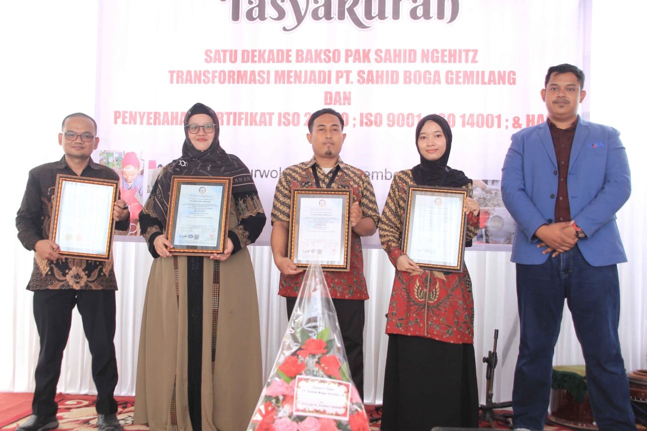 “Dengan empat standar internasional ini, PT Sahid Boga Gemilang memiliki modal kuat untuk masuk pasar global, sekaligus meningkatkan kepercayaan masyarakat dan mitra bisnis,” ujar Wahyu.