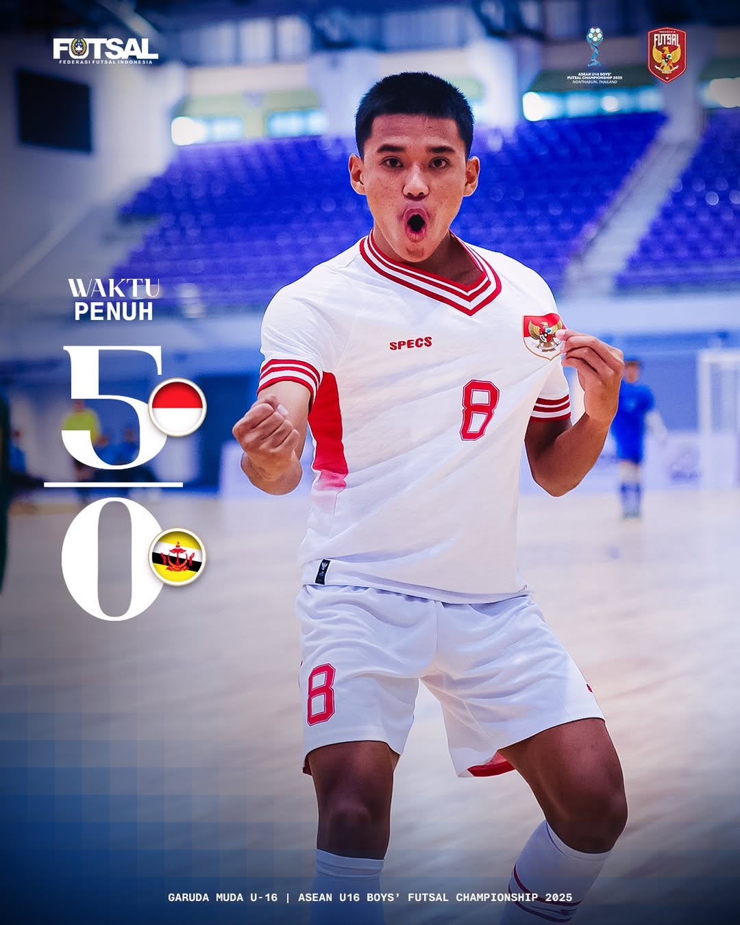 SERAYUNEWS-Timnas futsal ndonesia U16 membekuk Brunei Darussalam U16 dengan skor 5-0, Kamis (25/12/2025) jelang siang. Kemenangan itu membuat Indonesia memuncaki klasemen sementara ajang AFF Futsal U16 yang berlangsung di Thailand ini.