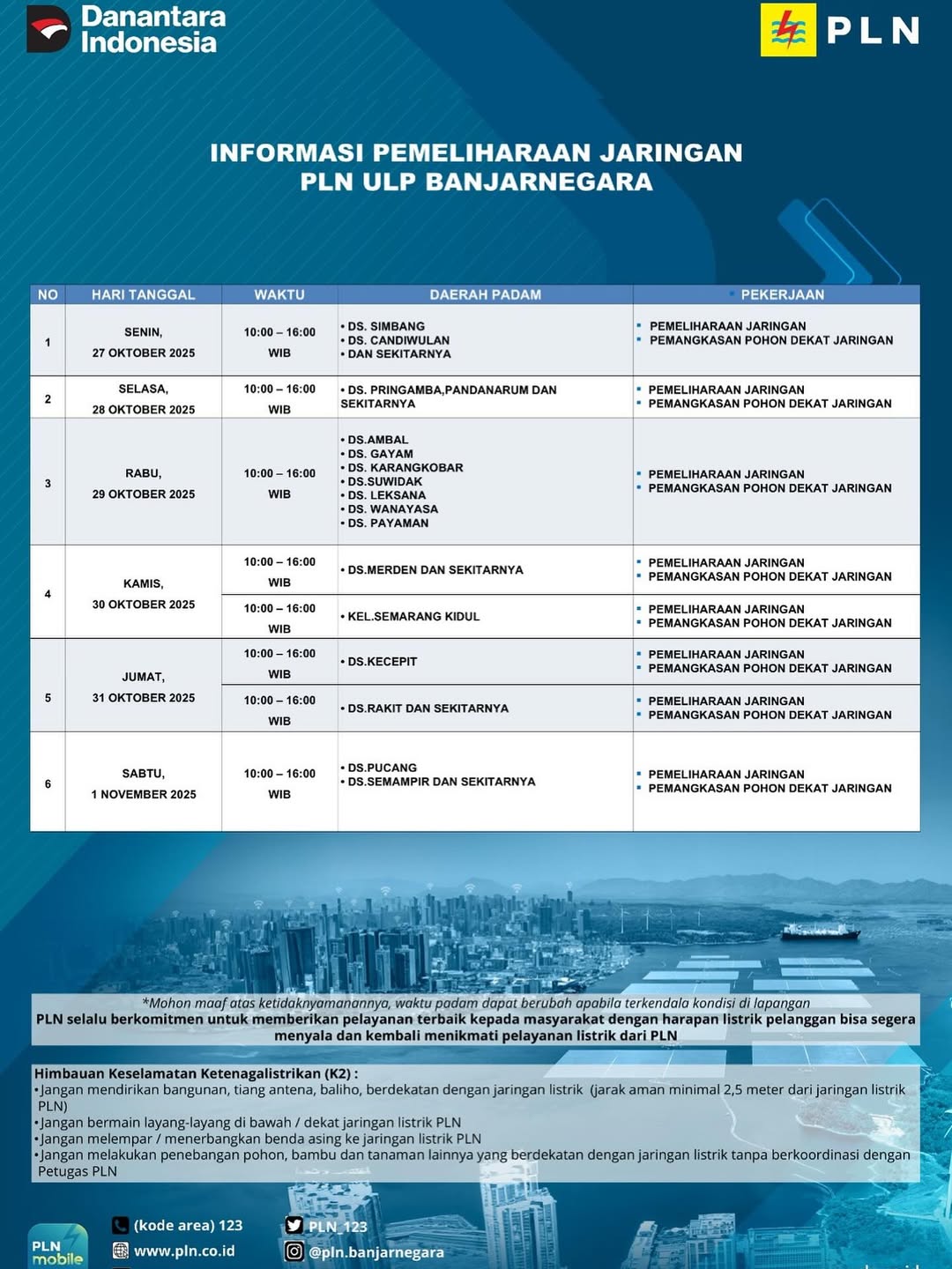 SERAYUNEWS-PLN ULP Banjarnegara melakukan pemadaman listrik untuk pekan ini. Setelah pemadaman listrik pada 27 Oktober 2025, pemadaman listrik kembali akan dilakukan pada 28 Oktober 2025 sampai 1 November 2025.