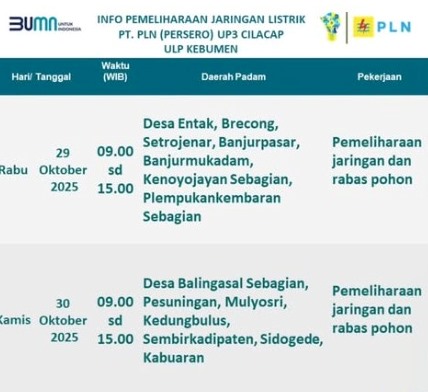 SERAYUNEWS-ULP Kebumen akan melakukan pemadaman listrik di beberapa wilayah. Pemadaman listrik akan berlangsung pada 29-30 Oktober 2025. Warga tedampak diimbau untuk mengantisipasi adanya pemadaman listrik tersebut.