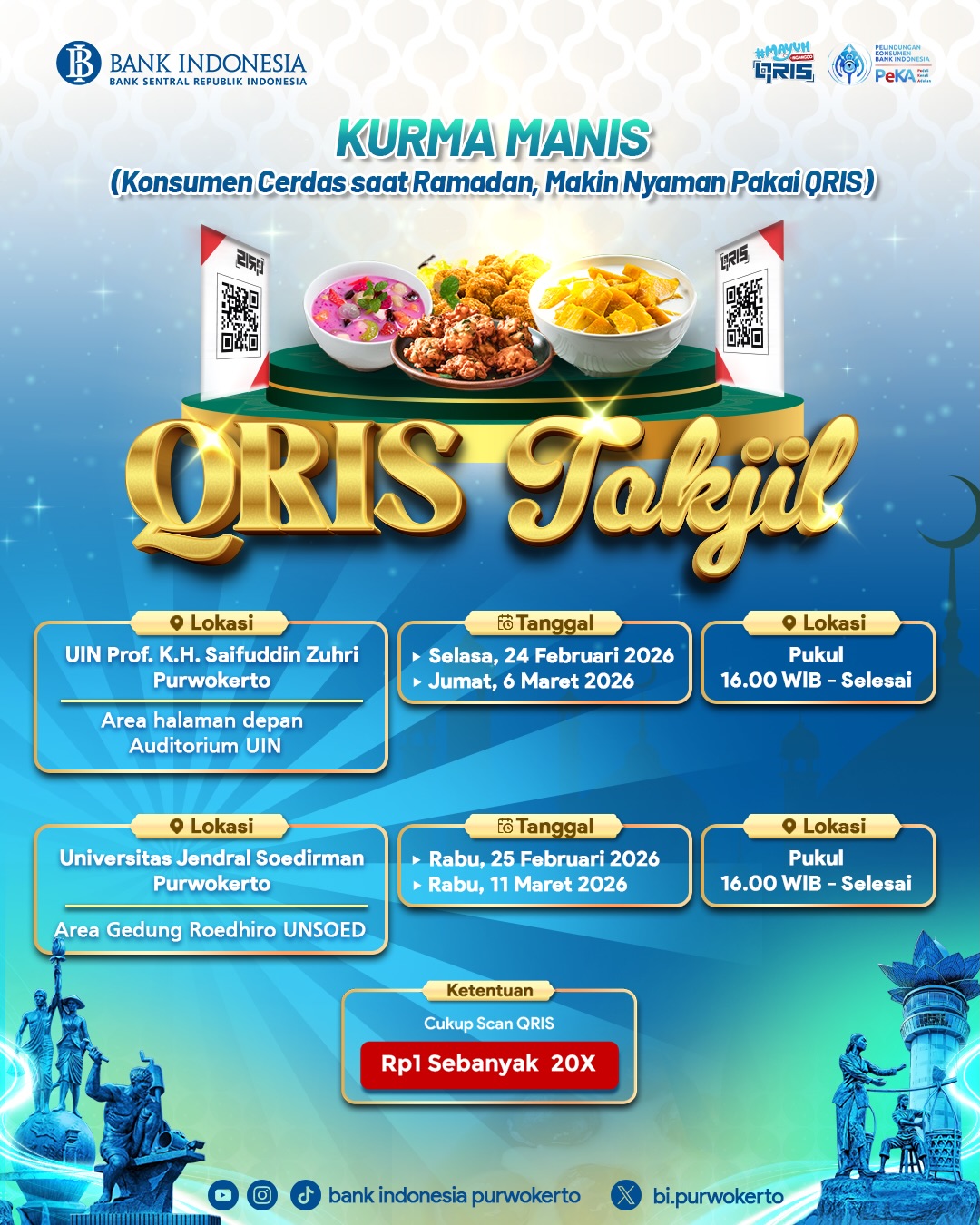 Melalui akun media sosial resminya, Kantor Perwakilan Bank Indonesia Purwokerto menghadirkan program KURMA MANIS (Konsumen Cerdas saat Ramadan, Makin Nyaman Pakai QRIS). Program ini memberikan kesempatan masyarakat mendapatkan takjil favorit dengan harga super hemat cukup menggunakan QRIS.