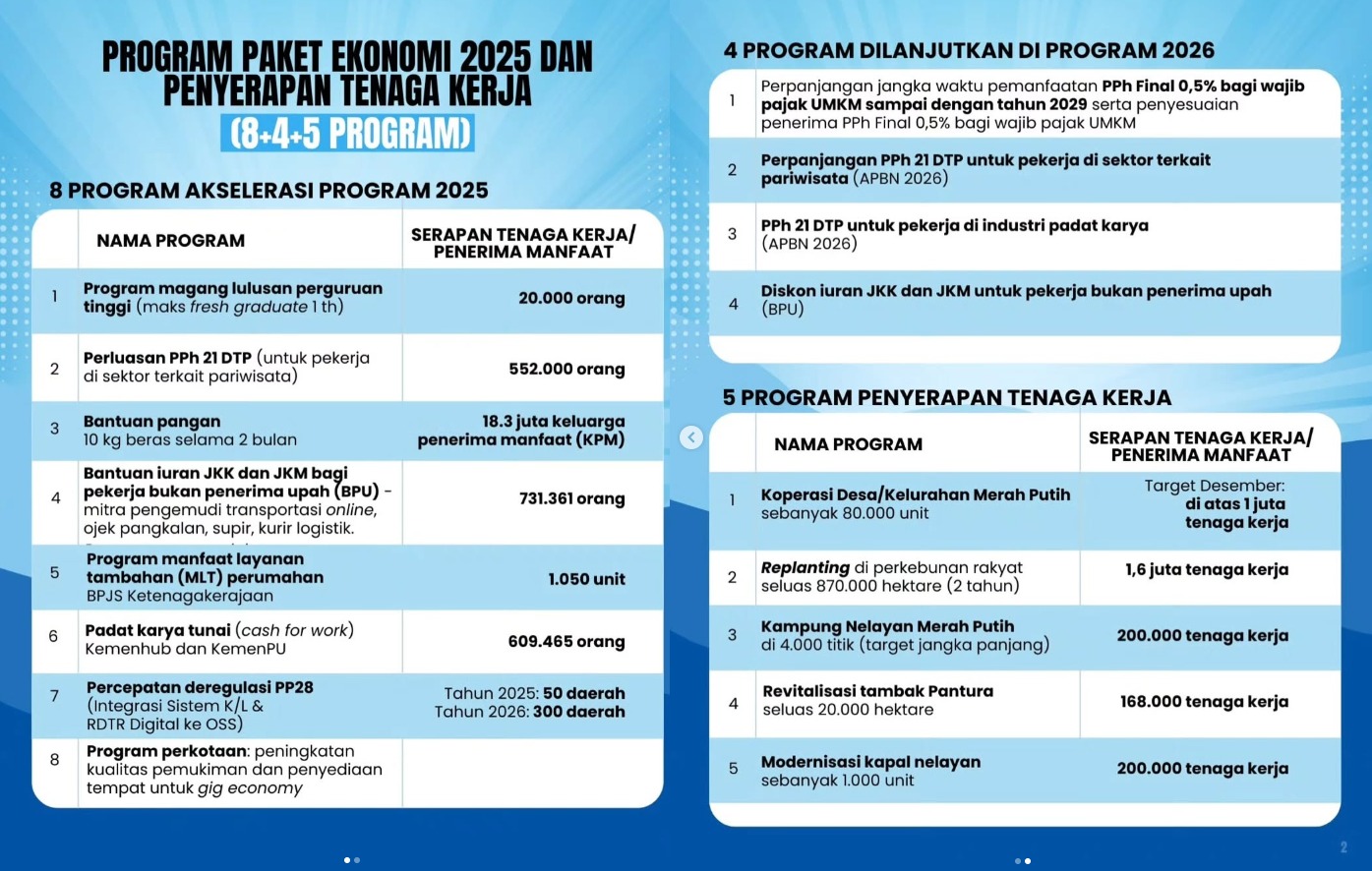 Paket ini mencakup 8 program akselerasi yang berlangsung mulai Tahun 2025, 4 program lanjutan pada 2026, serta 5 program penyerapan tenaga kerja yang menargetkan jutaan penerima manfaat.