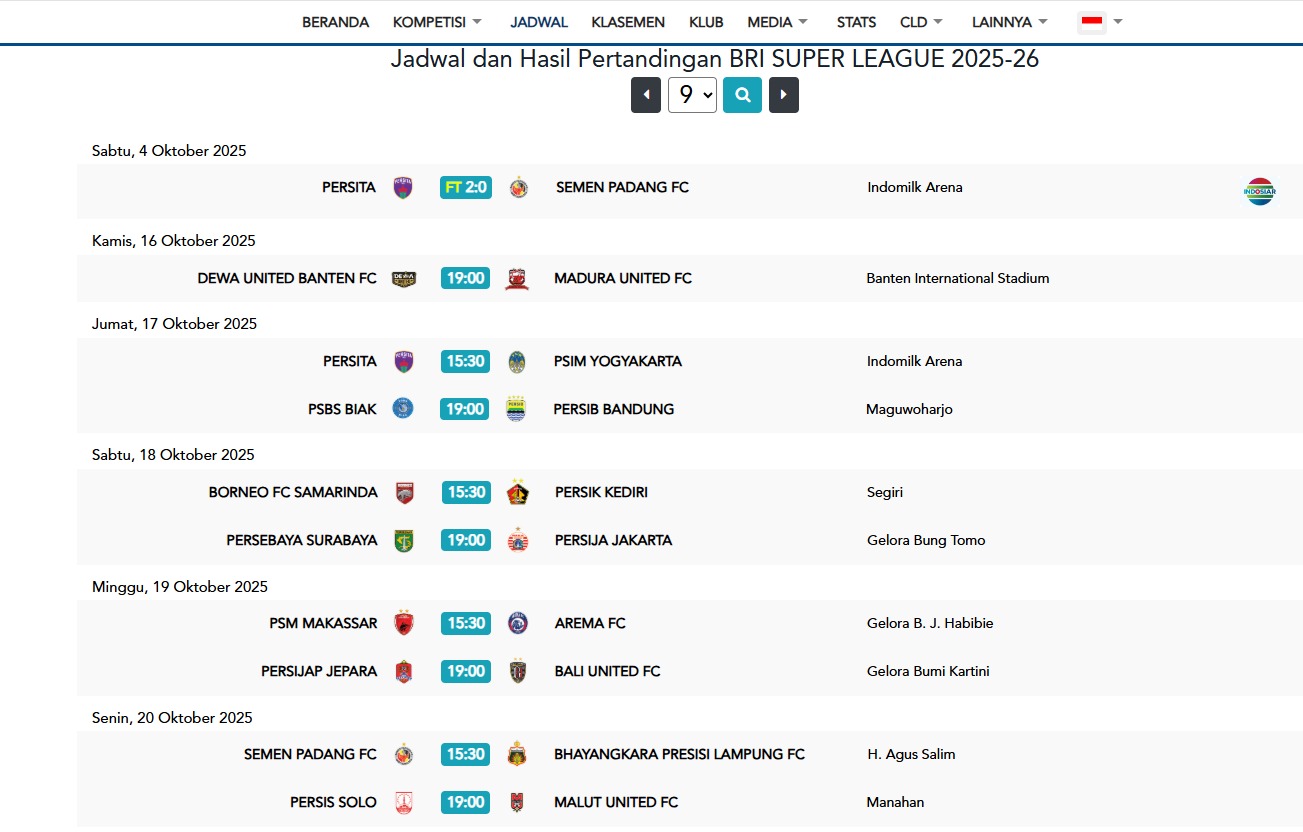 SERAYUNEWS- Setelah libur sekitar dua minggu, BRI Super League 2025/26 siap kembali mengguncang jagat sepak bola nasional. Pekan ke-9 yang berlangsung mulai 16 hingga 20 Oktober 2025 akan menghadirkan sembilan laga sengit.