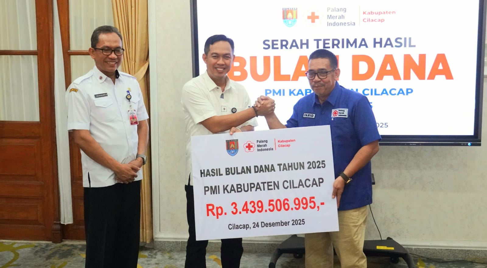 Hasil Bulan Dana PMI 2025 tersebut secara resmi diserahkan dalam acara yang digelar di Ruang Gadri Rumah Dinas Bupati Cilacap, Rabu (24/12/2025). Penyerahan dilakukan oleh Ketua Bulan Dana PMI Kabupaten Cilacap 2025, Sumbowo, kepada Bupati Cilacap Syamsul Auliya Rachman, lalu diteruskan kepada PMI Kabupaten Cilacap yang diterima langsung oleh Ketua PMI Cilacap, Farid Ma’ruf.