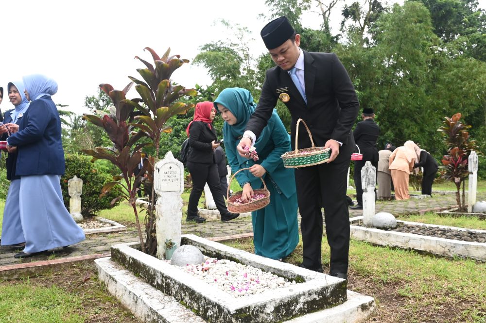 Usai upacara, Bupati Fahmi bersama jajaran Forkopimda dan istrinya melaksanakan ziarah dan tabur bunga di Taman Makam Pahlawan (TMP) Purbosaroyo.