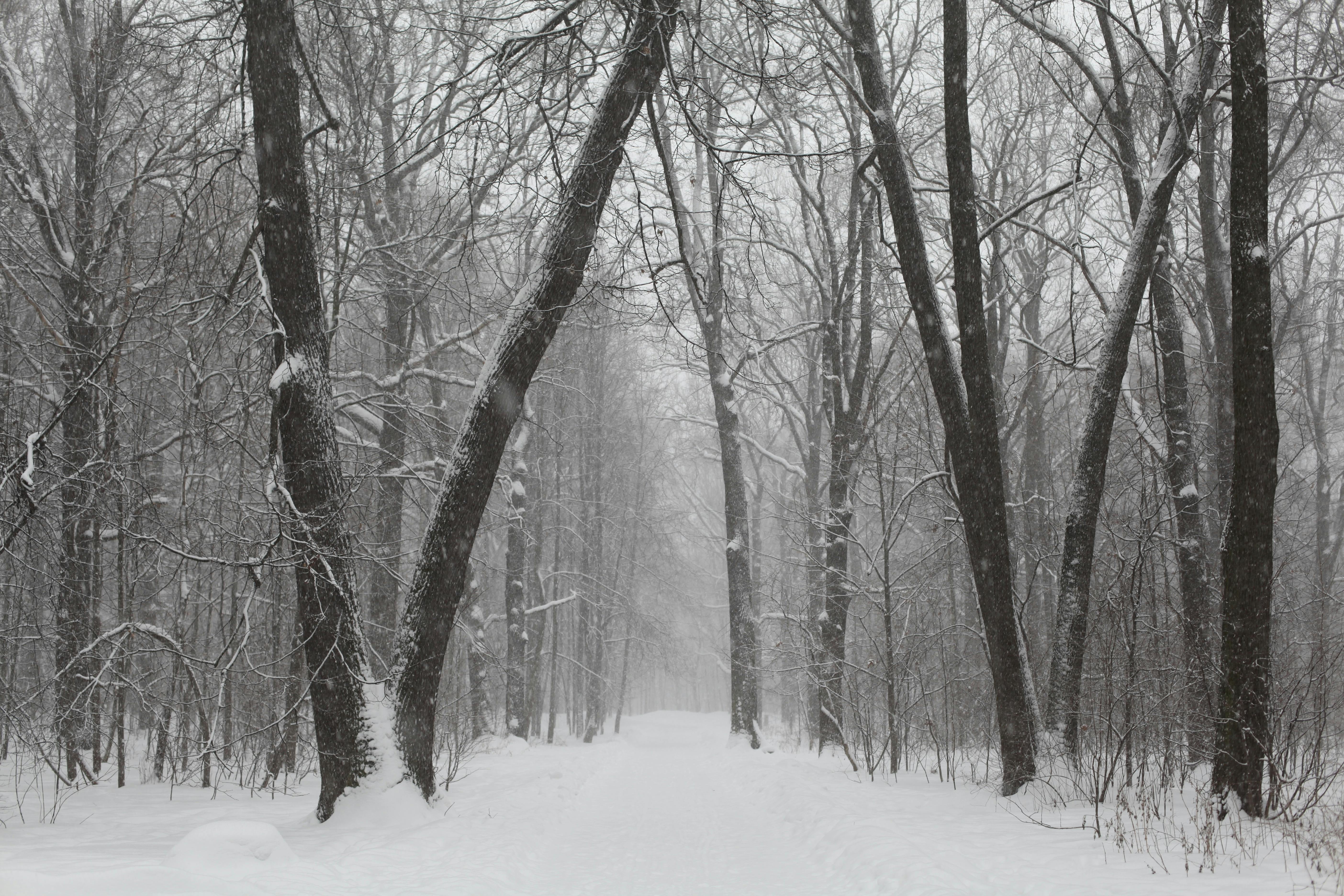 Latar belakang buram, dipenuhi putihnya salju, dan tokoh mengenakan jaket hitam.