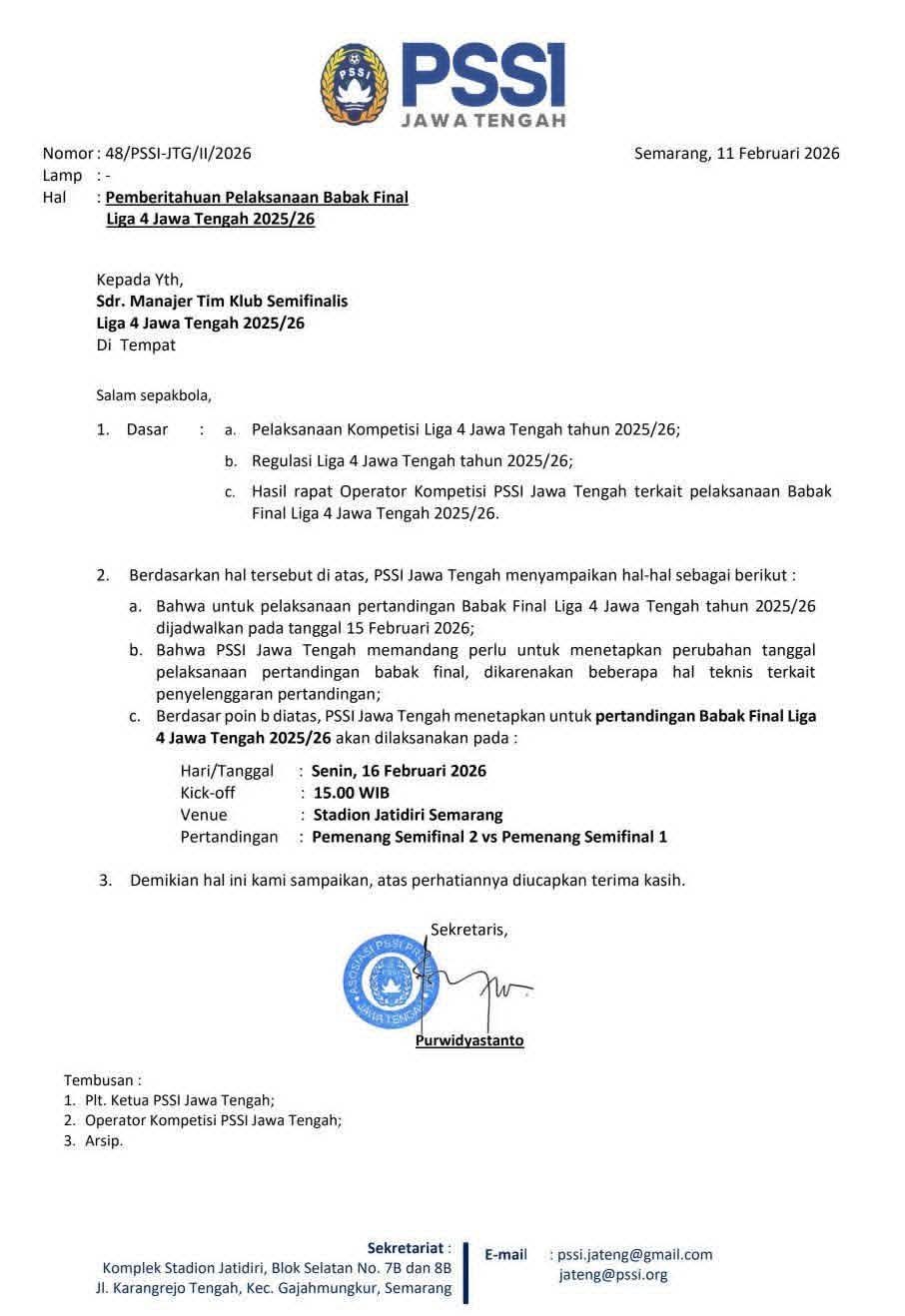 Dalam surat yang ditandatangani Sekretaris PSSI Jateng Purwidyastanto tersebut disebutkan bahwa pertandingan final akan dilaksanakan pada Senin, 15 Februari 2026 pukul 15.00 WIB.