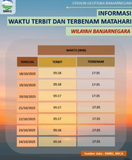Dikutip dari Instagram BMKG Banjarnegara, berikut waktu matahari terbit dan terbenam pada 18-24 Oktober 2025 di Banyumas Raya. Banyumas Raya yang dimaksud adalah wilayah Kabupaten Banyumas, Kabupaten Purbalingga, Kabupaten Banjarnegar, dan Kabupaten Cilacap.