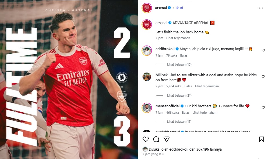Arsenal tampil lebih efektif meski berstatus tim tamu. The Gunners membuka keunggulan cepat melalui Ben White pada menit ke-7, sebelum memperlebar jarak lewat gol Viktor Gyökeres menit ke-49.