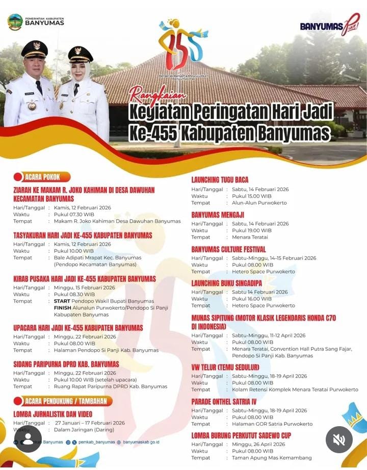 SERAYUNEWS– Pemerintah Kabupaten Banyumas resmi merilis rangkaian kegiatan Hari Jadi ke-455 Kabupaten Banyumas yang akan berlangsung sejak Bulan Februari hingga April 2026.