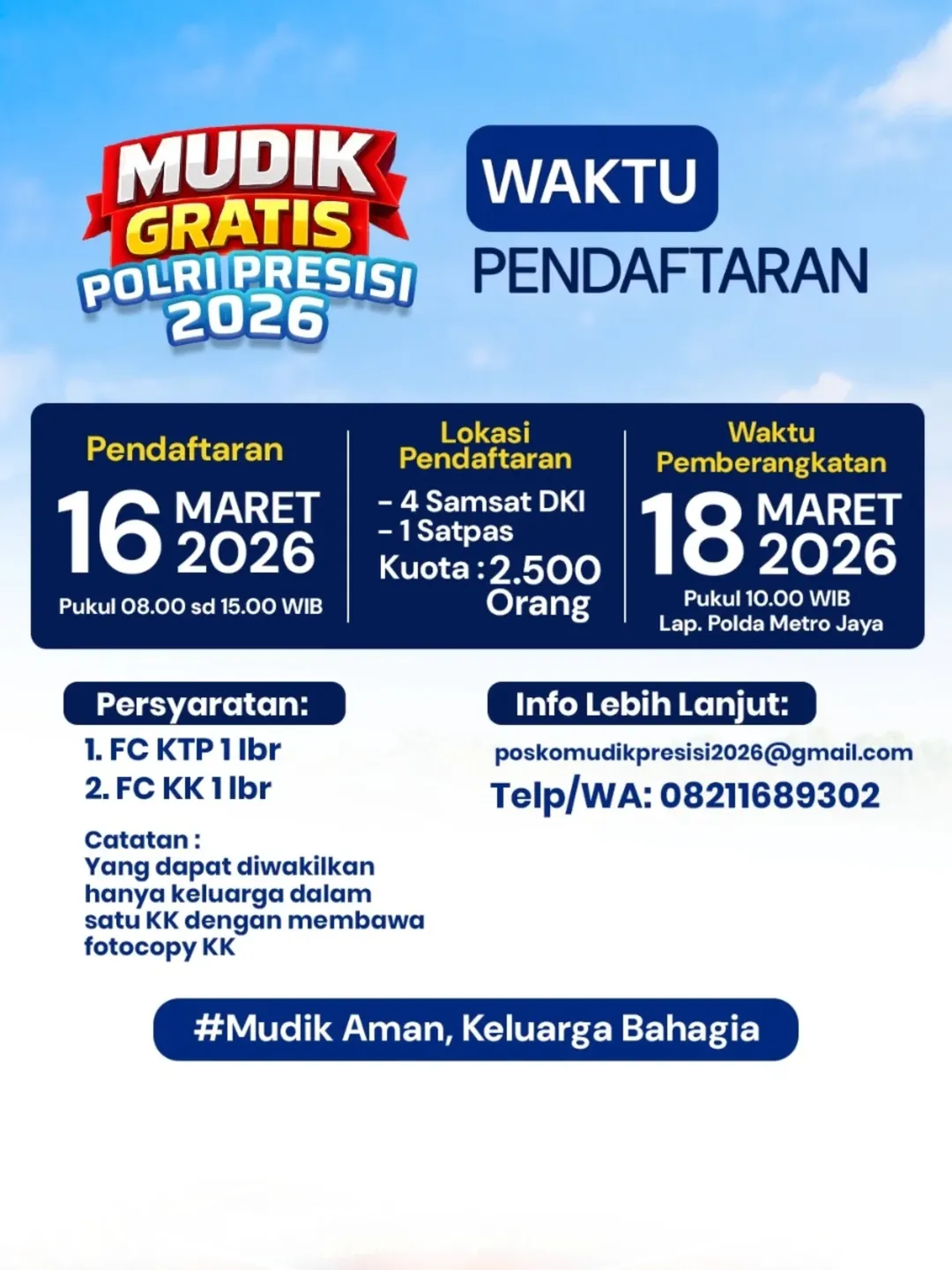 Polri kembali menghadirkan program Mudik Gratis Presisi pada tahun 2026 dengan total kuota sekitar 2.500 peserta.