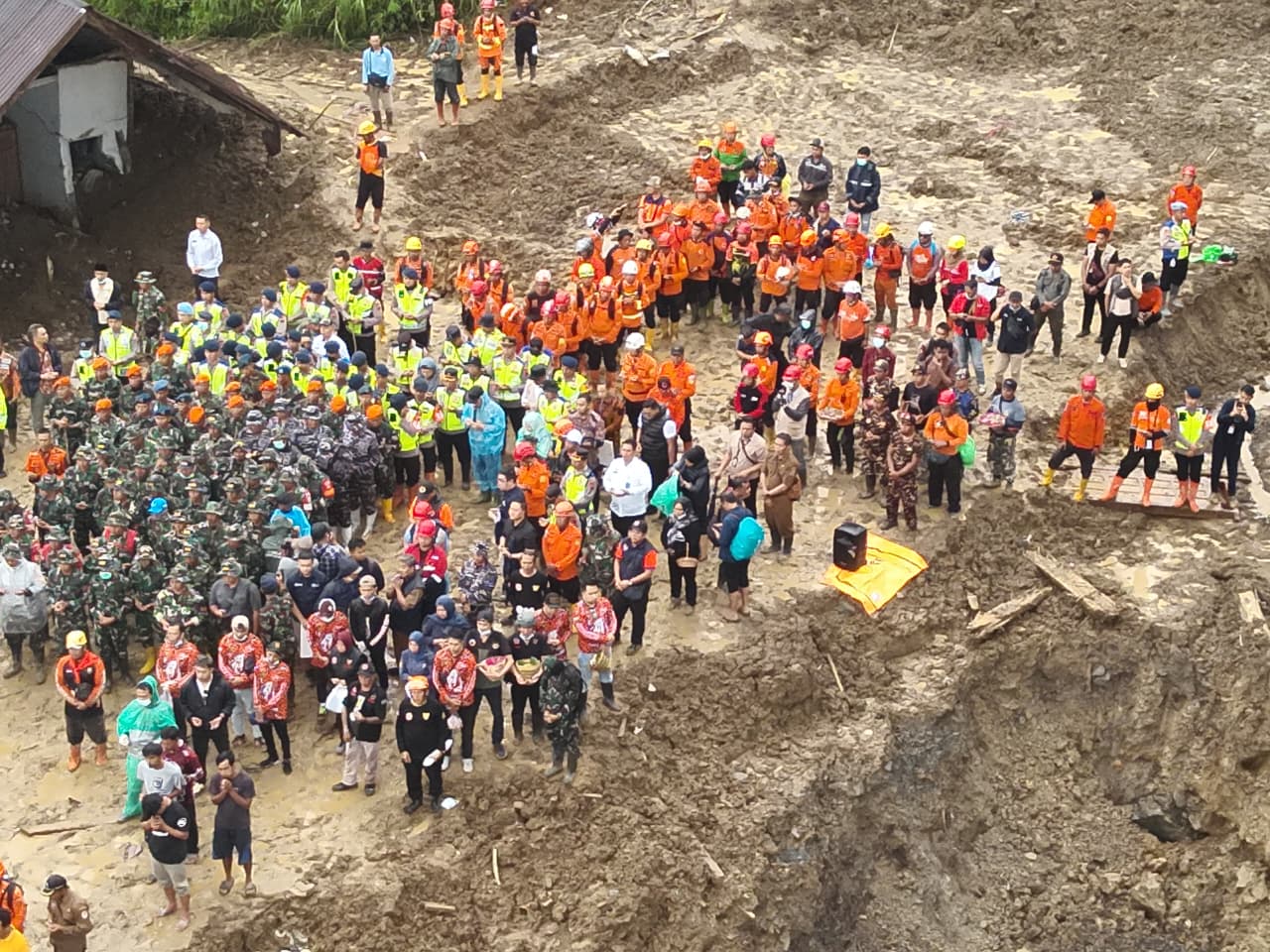 Kondisi hujan saat doa bersama dan tabur bunga di lokasi kejadian ini tidak menyurutkan langkah para keluarga korban, relawan, serta Tim SAR gabungan yang berada di lokasi bencana tanah longsor di Dusun Situkung Desa Pandanarum. Di atas tumpukan material tanah longsor, mereka berdiri melingkar, menundukkan kepala, menyatukan doa untuk para korban yang belum ditemukan.