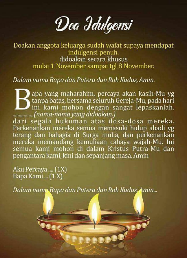 Doa indulgensi menjadi sarana bagi umat Katolik untuk memohon rahmat pengampunan bagi arwah orang beriman yang telah meninggal dunia.