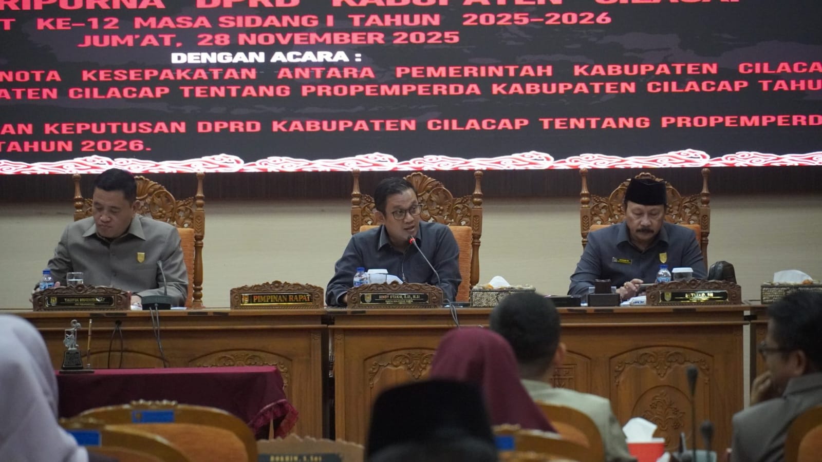 Rapat dipimpin Wakil Ketua DPRD Cilacap, Sindy Syakir, dan dihadiri langsung oleh Bupati Cilacap Syamsul Auliya Rachman, Wakil Bupati Ammy Amalia Fatma Surya, Ketua DPRD Taufik Nurhidayat, jajaran Wakil Ketua DPRD, anggota DPRD, perwakilan Forkopimda, serta sejumlah pejabat Pemkab Cilacap.