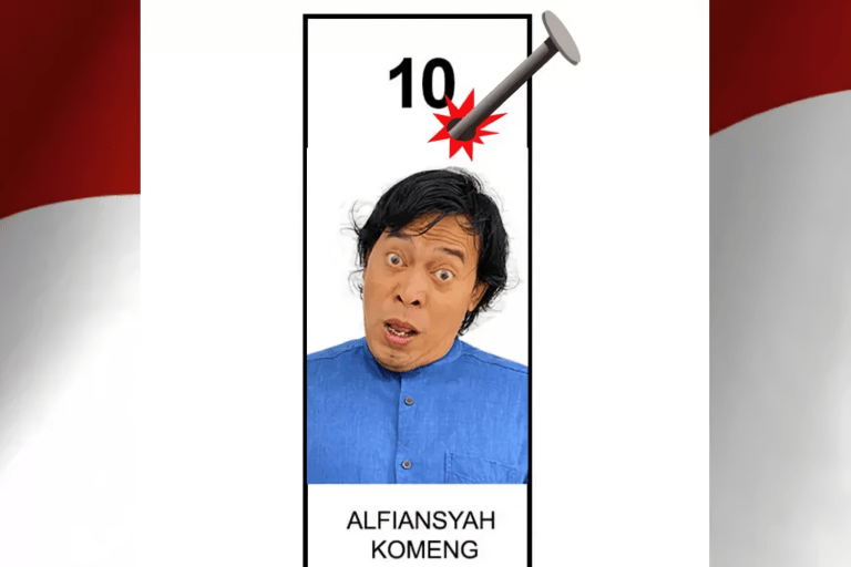 Foro Komeng di kertas suara menggunakan baju biru dengan ekspresi wajah yang mengundang gelak tawa. Tampak ekspresi wajah seperti orang kaget.