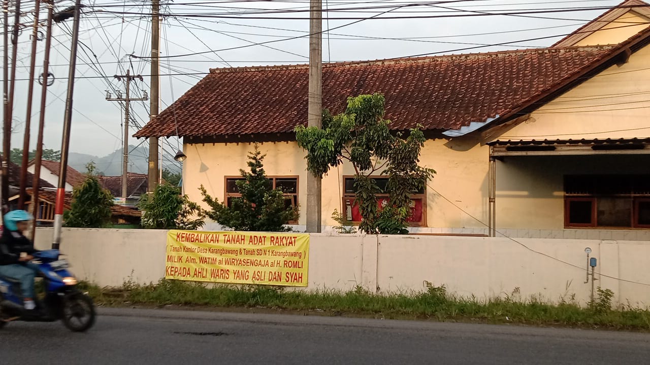 Spanduk itu bertuliskan tuntutan agar tanah adat rakyat yang kini menjadi lokasi Kantor Desa Karangbawang dan SDN 1 Karangbawang dikembalikan kepada ahli waris yang mengklaim sebagai pemilik sah.