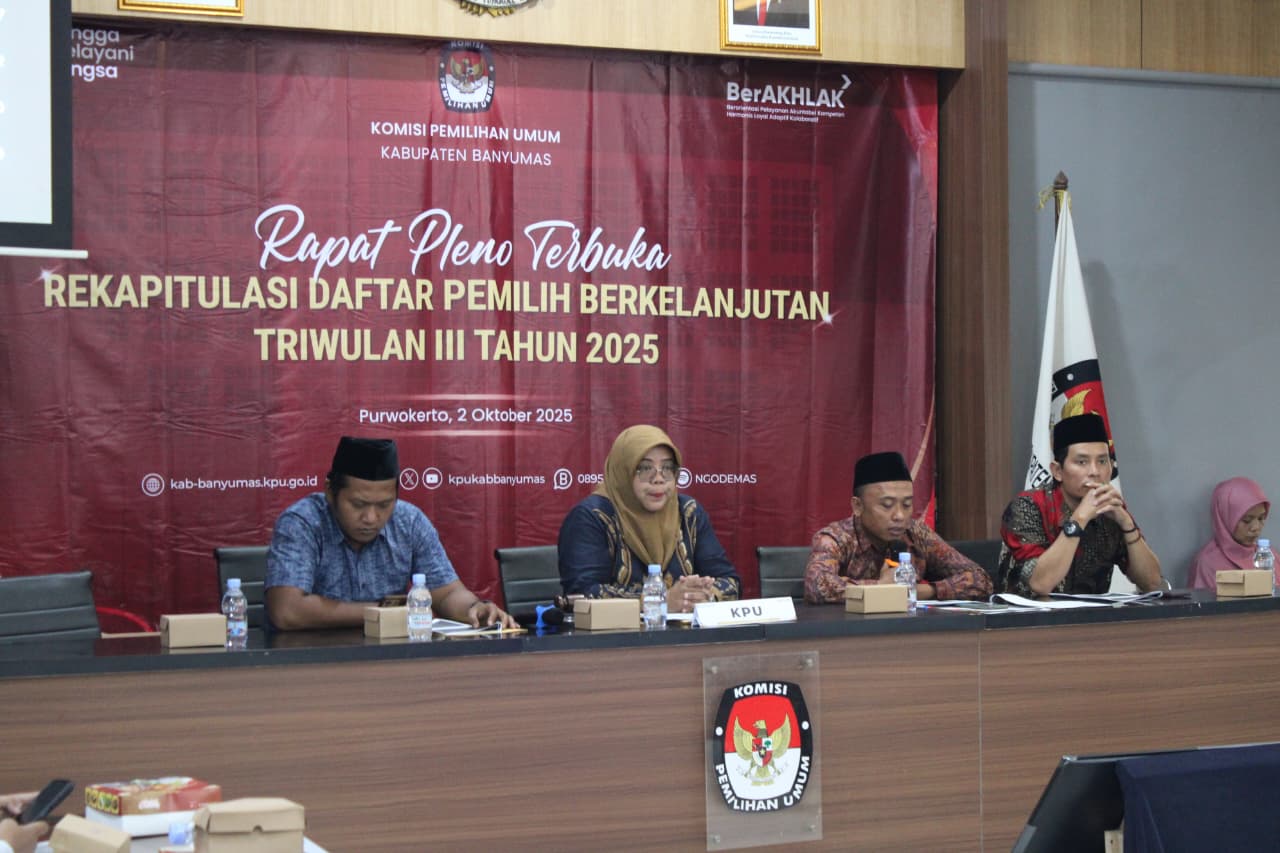 SERAYUNEWS – Komisi Pemilihan Umum (KPU) Kabupaten Banyumas telah melaksanakan Rapat Pleno Terbuka Rekapitulasi Pemutakhiran Data Pemilih Berkelanjutan (PDPB) Triwulan III Tahun 2025.