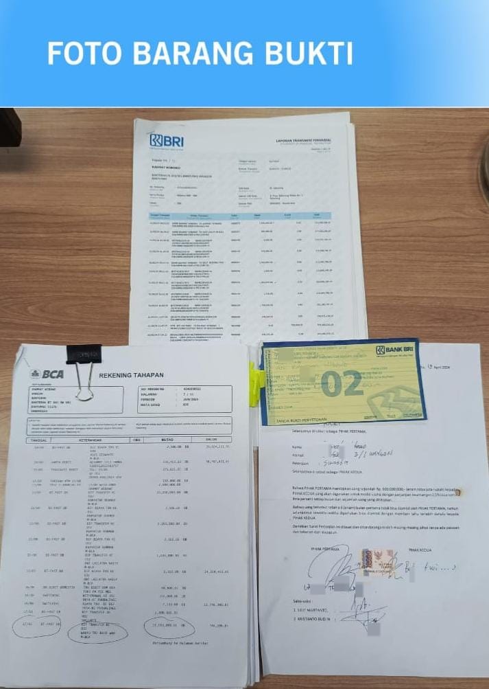 Selain mengamankan pelaku, polisi juga menyita sejumlah barang bukti, di antaranya dokumen rekening koran dari beberapa bank, slip transfer, serta surat perjanjian kerja sama yang ditandatangani kedua belah pihak.