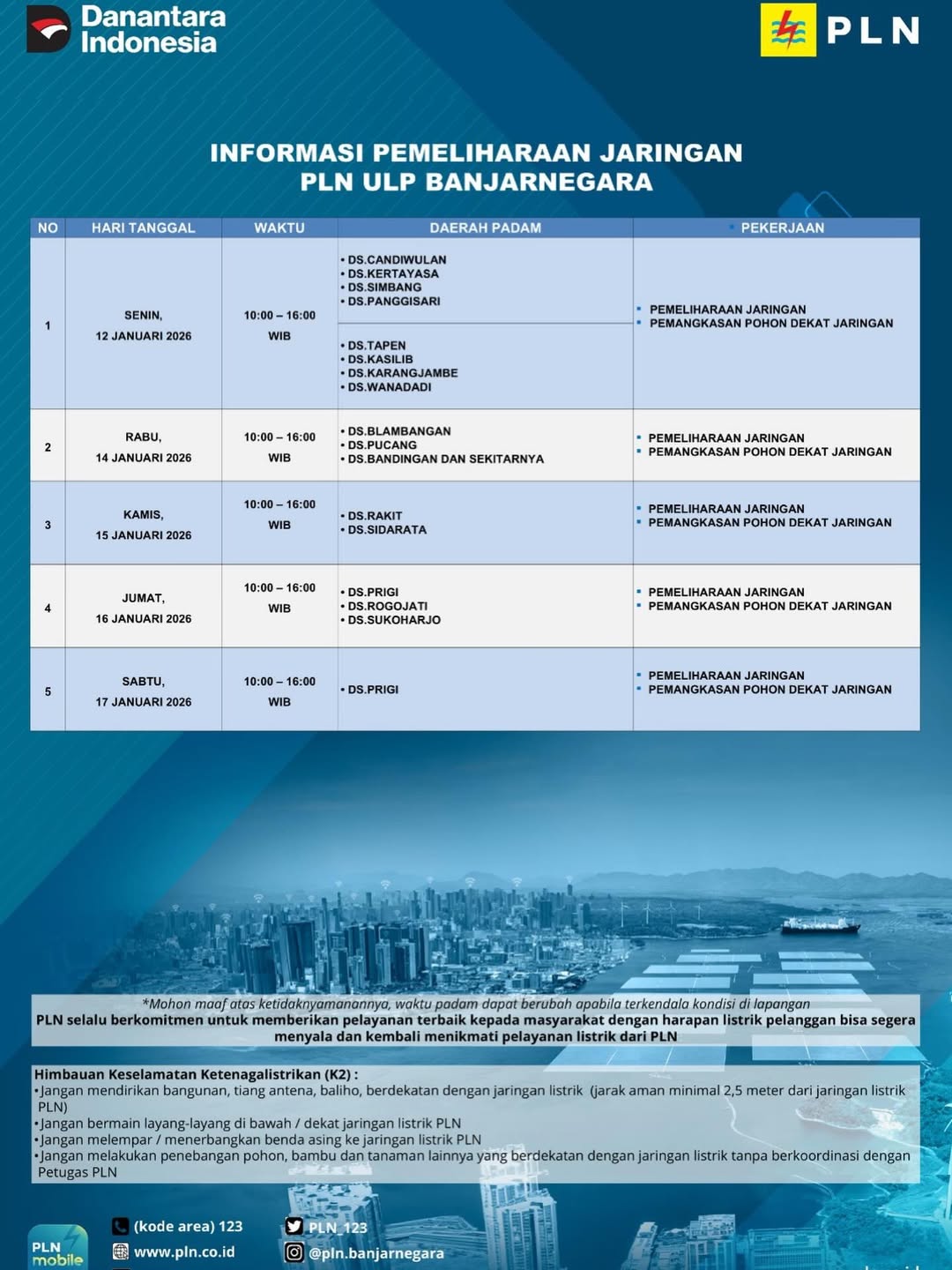 Atas rencana pemadaman ini warga terdampak bisa melakukan antisipasi. Apalagi listrik sangat dibutuhkan di masa kini. Dikutip dari Instagram PLN Banjarnegara, berikut perincian pemadaman listrik pada 14-17 Januari 2026.