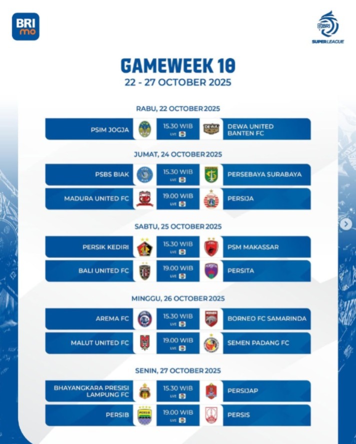 SERAYUNEWS- Sebanyak sembilan laga seru akan mewarnai pekan ke-10 BRI Super League 2025/2026 yang berlangsung pada 22–27 Oktober 2025.
