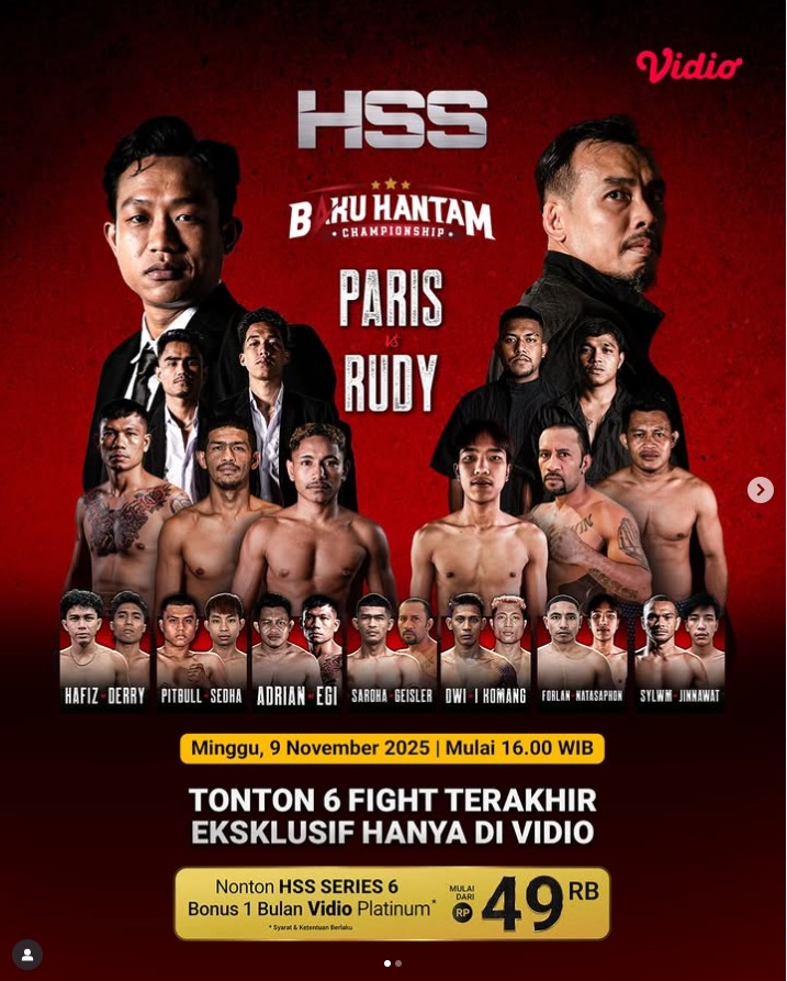 Dengan harga tiket PPV hanya Rp49.000, penonton sudah bisa menikmati seluruh pertarungan HSS Series 6 secara eksklusif di platform Vidio, mulai dari Main Event hingga Undercard.