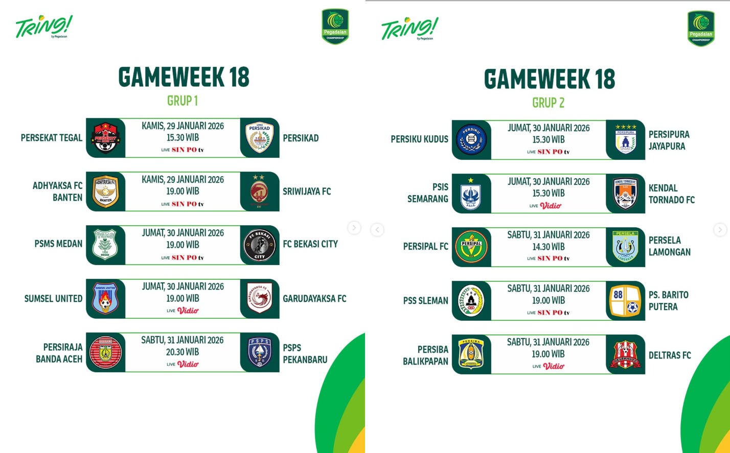 Seluruh pertandingan BRI Super League 2025/2026 disiarkan secara langsung melalui Indosiar dan layanan live streaming Vidio, sesuai jadwal resmi operator liga.