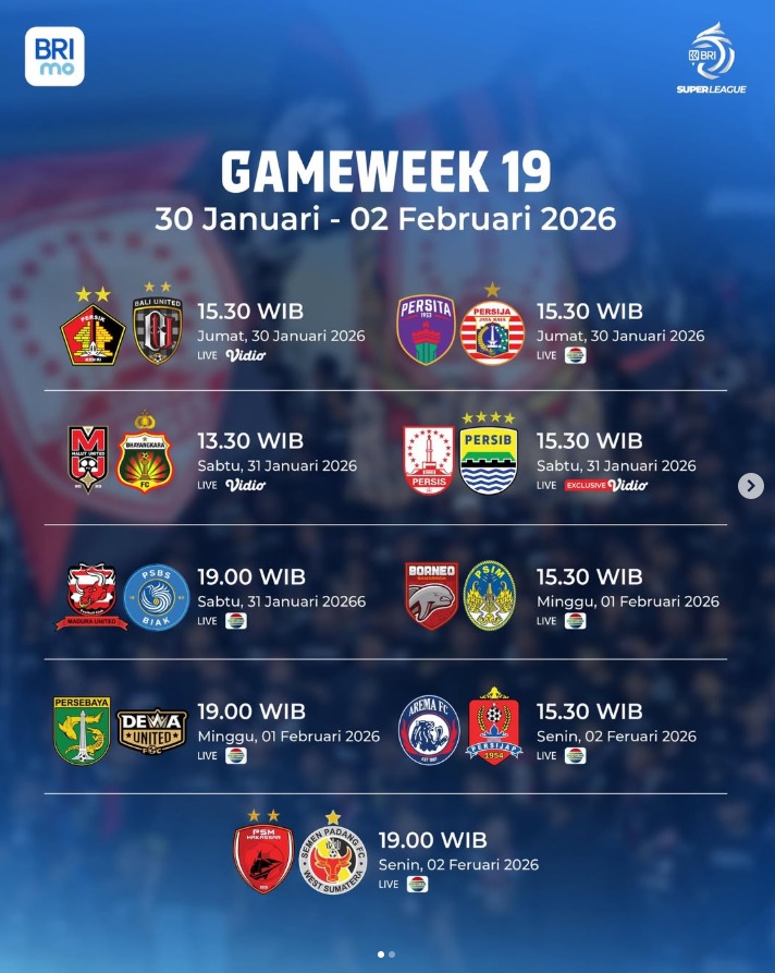 Seluruh pertandingan BRI Super League 2025/2026 disiarkan secara langsung melalui Indosiar dan layanan live streaming Vidio, sesuai jadwal resmi operator liga.