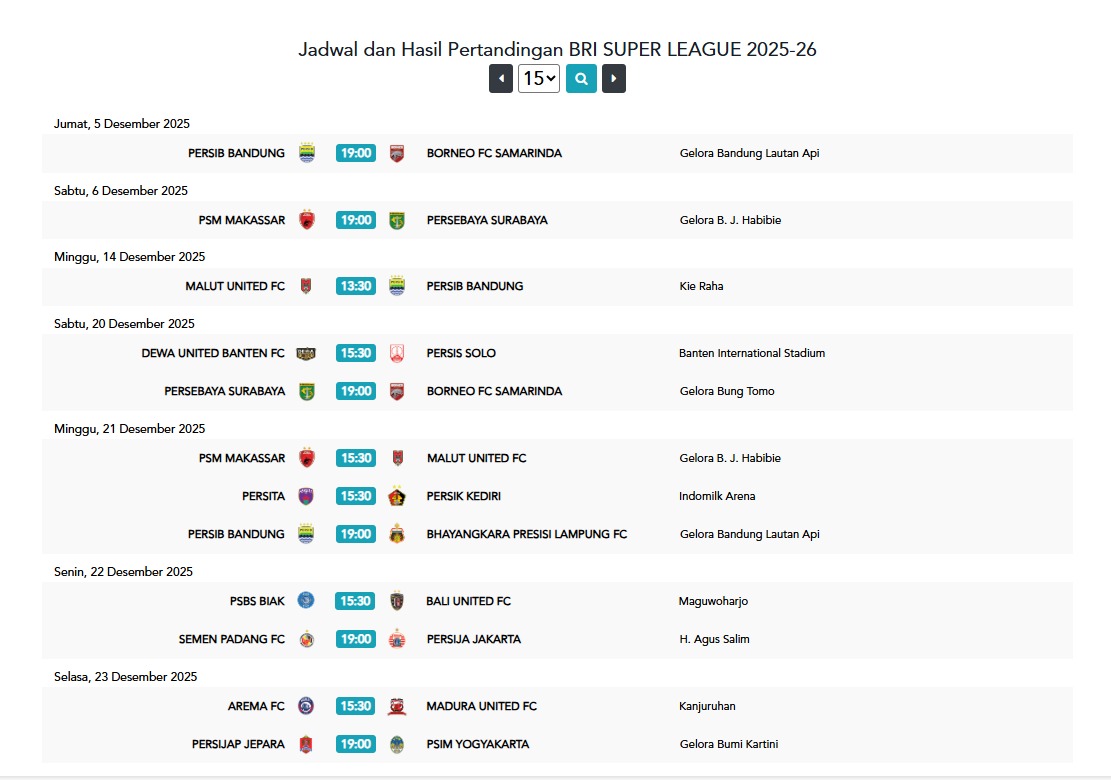 Pekan ke-15 menghadirkan banyak drama, persaingan panas di papan atas, dan perjuangan berat di zona degradasi. Dengan jadwal padat Desember, setiap pertandingan akan menentukan arah kompetisi memasuki awal 2026.
