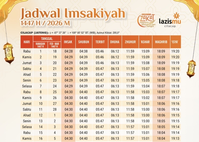 Di wilayah Cilacap dan sekitarnya, jadwal imsakiyah Ramadhan 1447 H/2026 M telah disiapkan dan dipublikasikan oleh Lazismu Cilacap.