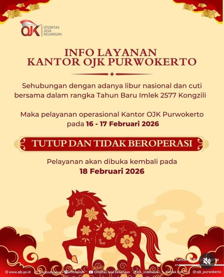 Dalam rangka libur nasional dan cuti bersama Tahun Baru Imlek 2577 Kongzili, pelayanan operasional di Kantor Otoritas Jasa Keuangan (OJK) Purwokerto akan dihentikan sementara selama dua hari.