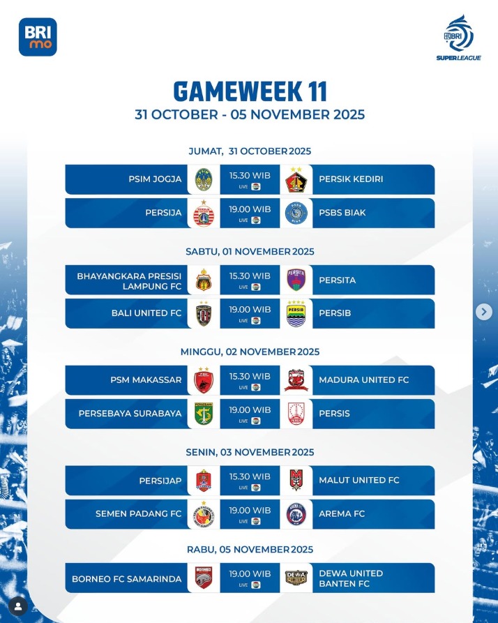 SERAYUNEWS- Persaingan di BRI Super League 2025/26 kian memanas. Senin, 3 November 2025, akan menjadi hari penting bagi empat tim yang siap tampil habis-habisan demi memperbaiki posisi di klasemen sementara.