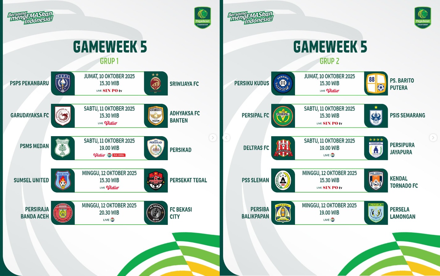 Untuk memudahkan penggemar sepak bola Tanah Air, berikut jadwal siaran langsung Pegadaian Championship 2025–26 pekan ini: