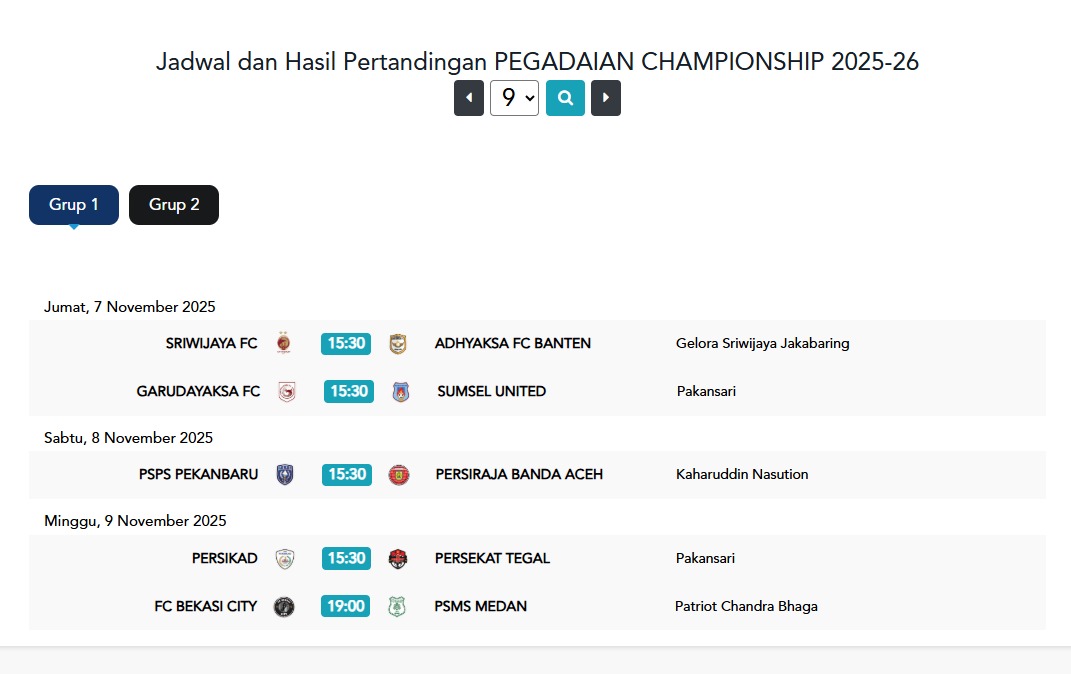 Berikut jadwal lengkap pertandingan Liga 2 pekan ke-9 untuk Grup 1 dan Grup 2: