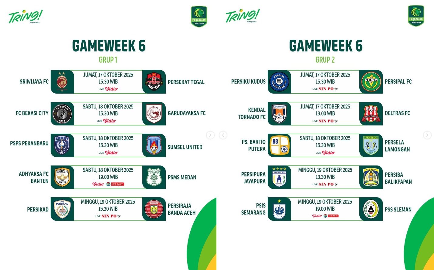 Keseruan pekan ke-6 bakal dibuka dengan duel krusial Sriwijaya FC vs Persekat Tegal di Stadion Gelora Sriwijaya Jakabaring, Palembang, pada Jumat, 17 Oktober 2025, pukul 15.30 WIB.