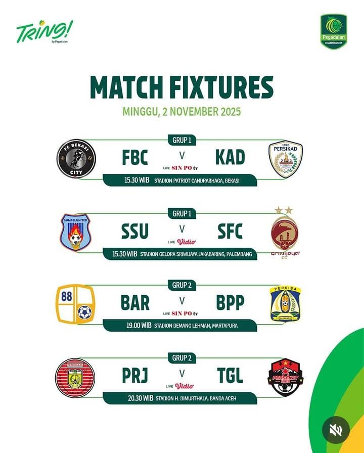 Hari ini, Minggu tanggal 2 November 2025, empat laga seru siap digelar di berbagai stadion Tanah Air.