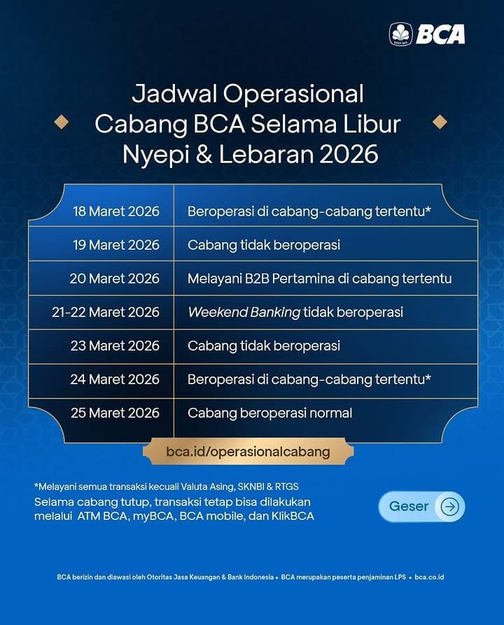 BCA merilis jadwal operasional kantor cabang selama periode libur Nyepi dan Idulfitri 2026 sebagai berikut: