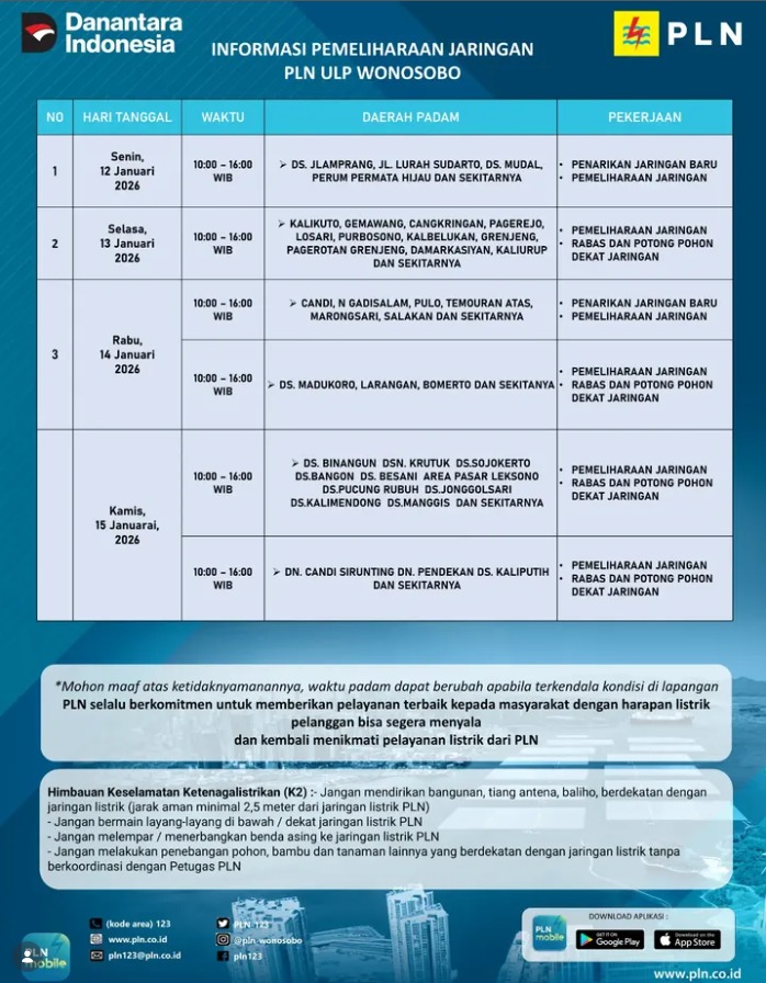 Melansir pengumuman resmi PLN Wonosobo, pada hari Rabu (14/1/2026), PLN ULP Wonosobo akan menghentikan aliran listrik sementara di sejumlah wilayah mulai pukul 10.00 hingga 16.00 WIB.