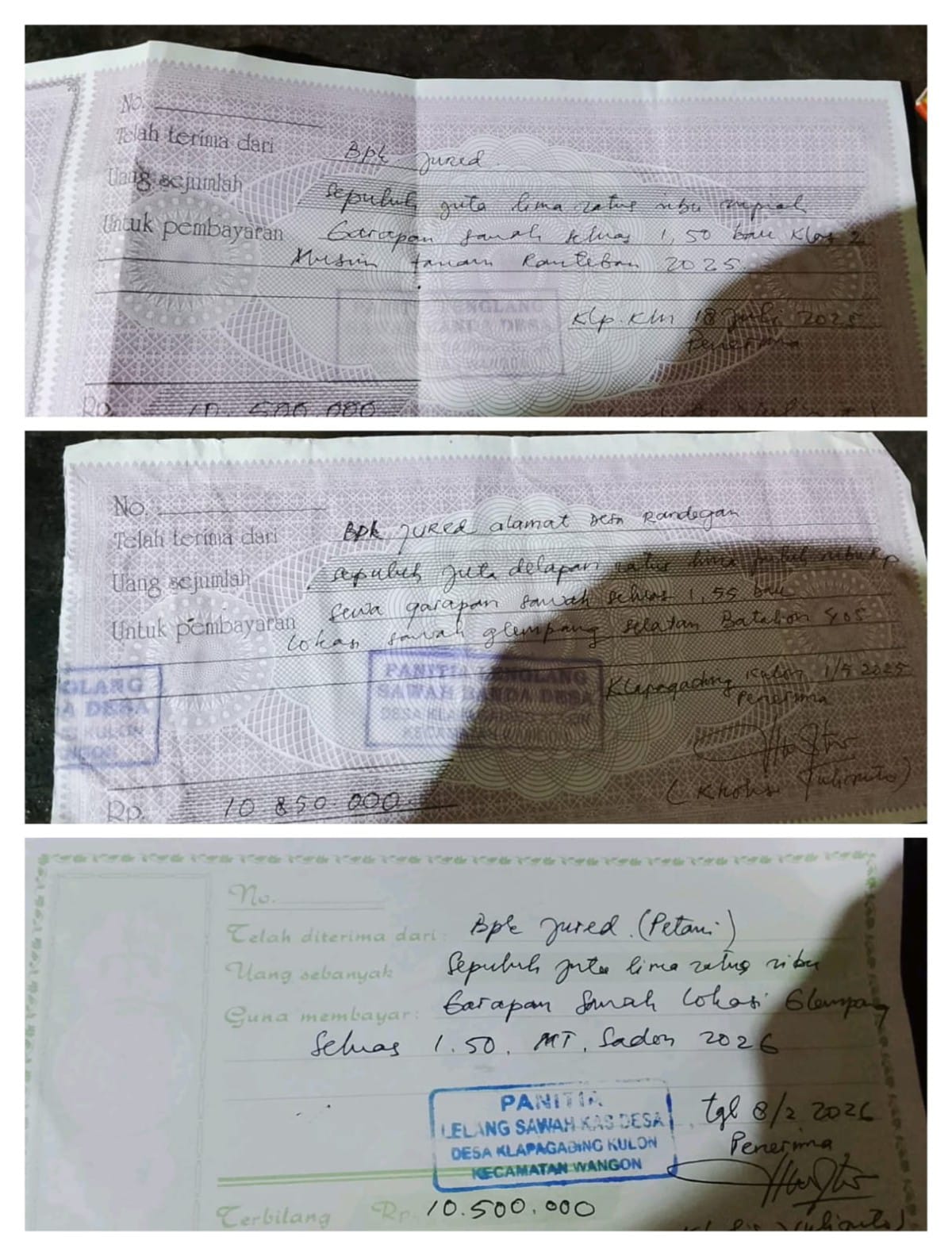 SERAYUNEWS – Karsono, Kepala Desa Klapagading Kulon, membongkar dugaan penyimpangan dana hasil penjualan sawah kas desa yang menyeret Ketua Badan Permusyawaratan Desa (BPD) berinisial KY. Kecurigaan ini diperkuat oleh temuan bukti berupa kwitansi berstempel panitia lelang yang sah.