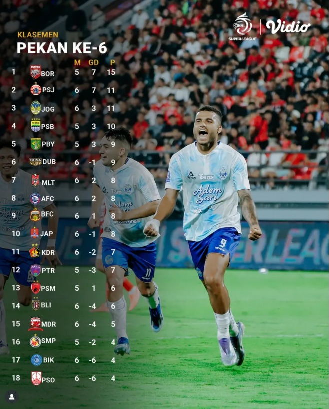Puncak klasemen masih dikuasai Borneo FC Samarinda yang tampil konsisten. Pesut Etam menundukkan Persis Solo 1-0 di Stadion Segiri, Samarinda, Senin (22/9/2025), sekaligus menjaga rekor tak terkalahkan hingga pekan ke-6.