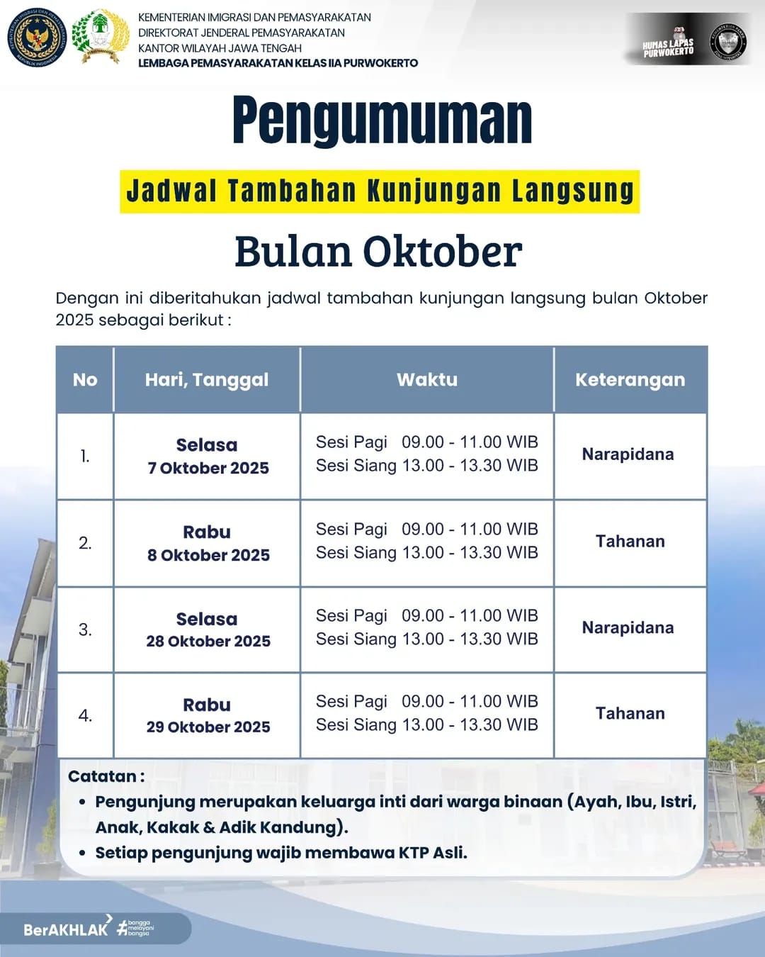 SERAYUNEWS–Lembaga Pemasyarakatan (Lapas) Kelas IIA Purwokerto mengumumkan adanya jadwal tambahan kunjungan langsung bagi warga binaan pada Oktober 2025. Kebijakan ini diberikan untuk memberikan kesempatan lebih luas bagi keluarga inti narapidana maupun tahanan untuk melakukan kunjungan tatap muka.