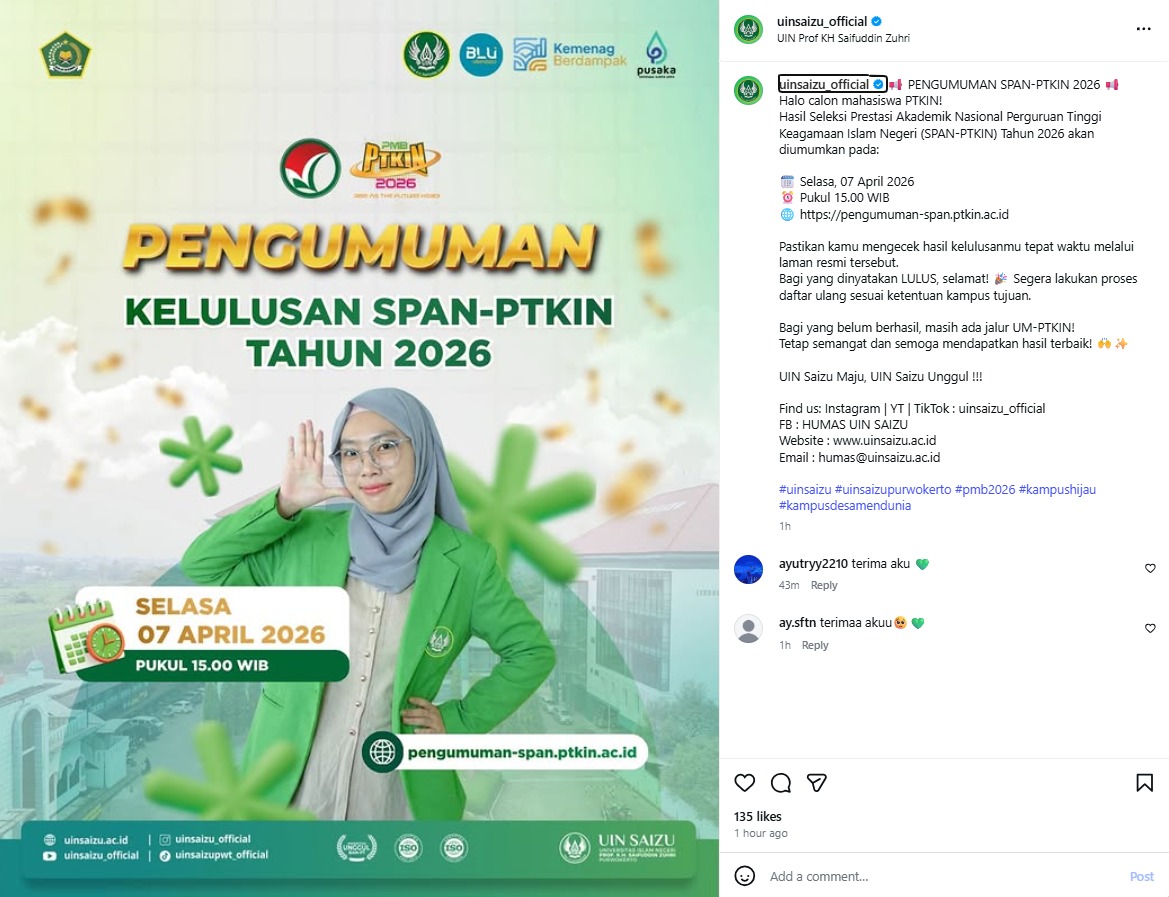 SERAYUNEWS- Pengumuman hasil Seleksi Prestasi Akademik Nasional Perguruan Tinggi Keagamaan Islam Negeri (SPAN-PTKIN) 2026 resmi akan dibuka pada Selasa, 7 April 2026 pukul 15.00 WIB.