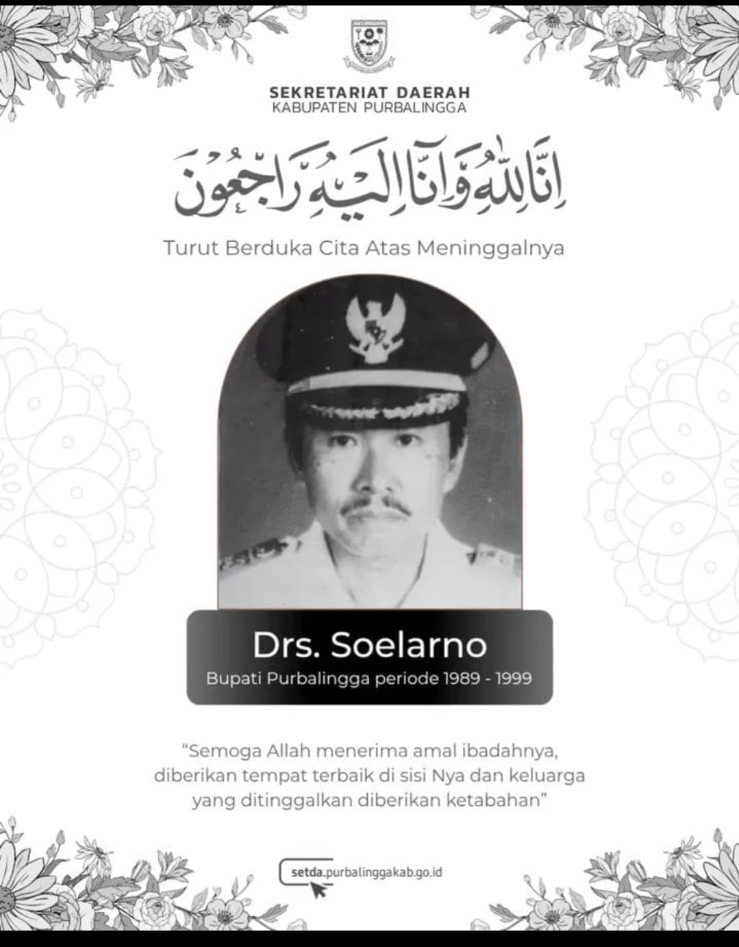 SERAYUNEWS – Kabar duka menyelimuti Kabupaten Purbalingga. Mantan Bupati Purbalingga Drs. Soelarno bin Wiryokaryono meninggal dunia pada usia 82 tahun.
