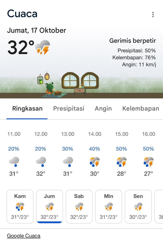 Sabtu 19 April 2025: Hujan ringan dengan cuaca 23 sampai 30 derajat celcius dan kelembapan 70 sampai 96 persen.