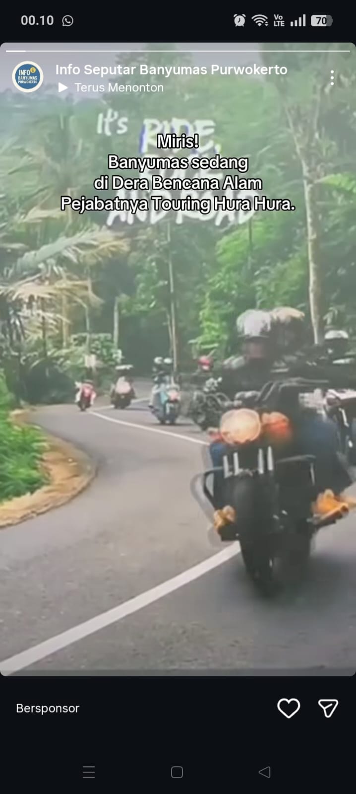 Postingan di akun facebook Info Seputar Banyumas Purwokerto, menunjukan vidio dengan durasi sekitar 40 detik. Dalam video tersebut, sejumlah pejabat sedang melakukan kegiatan touring, mengendari kendaraan roda dua.