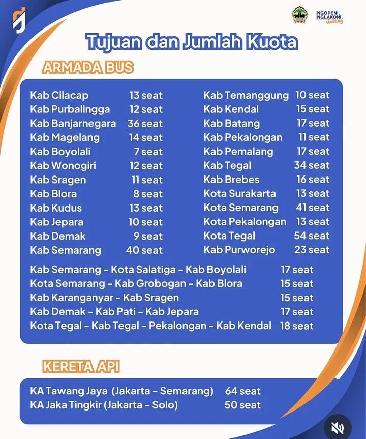 Berikut daftar tujuan perjalanan beserta kuota kursi yang masih tersedia: