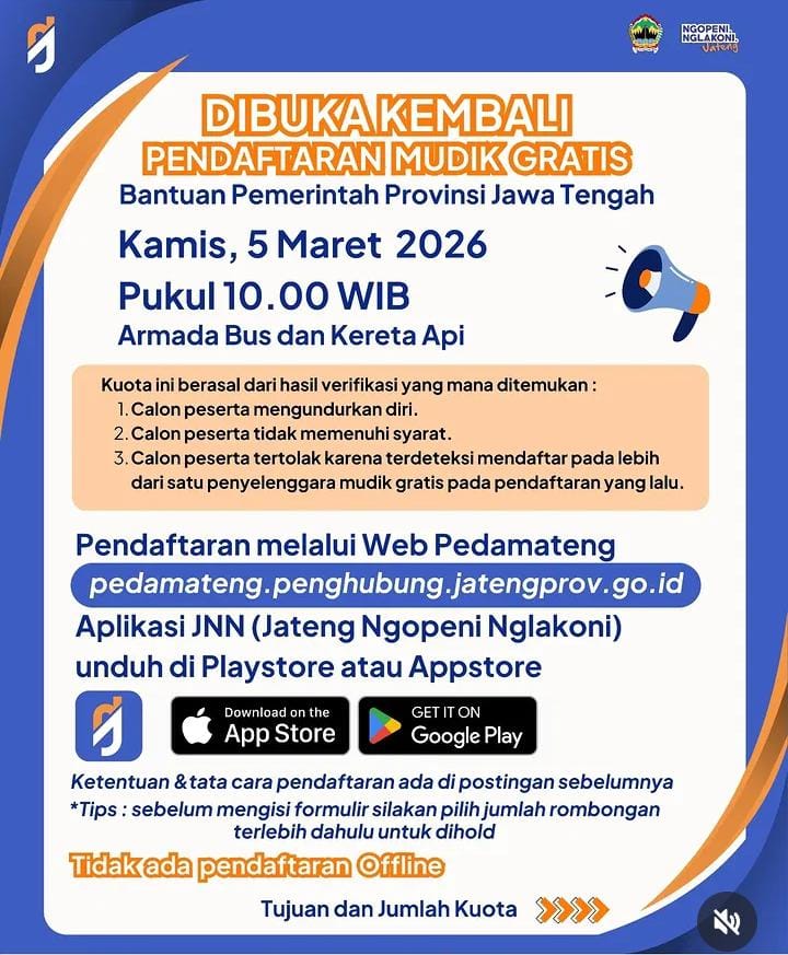 SERAYUNEWS- Pemerintah Provinsi Jawa Tengah kembali membuka pendaftaran program Mudik Gratis Jateng 2026 bagi masyarakat yang ingin pulang ke kampung halaman menjelang Hari Raya Idulfitri 1447 Hijriah.