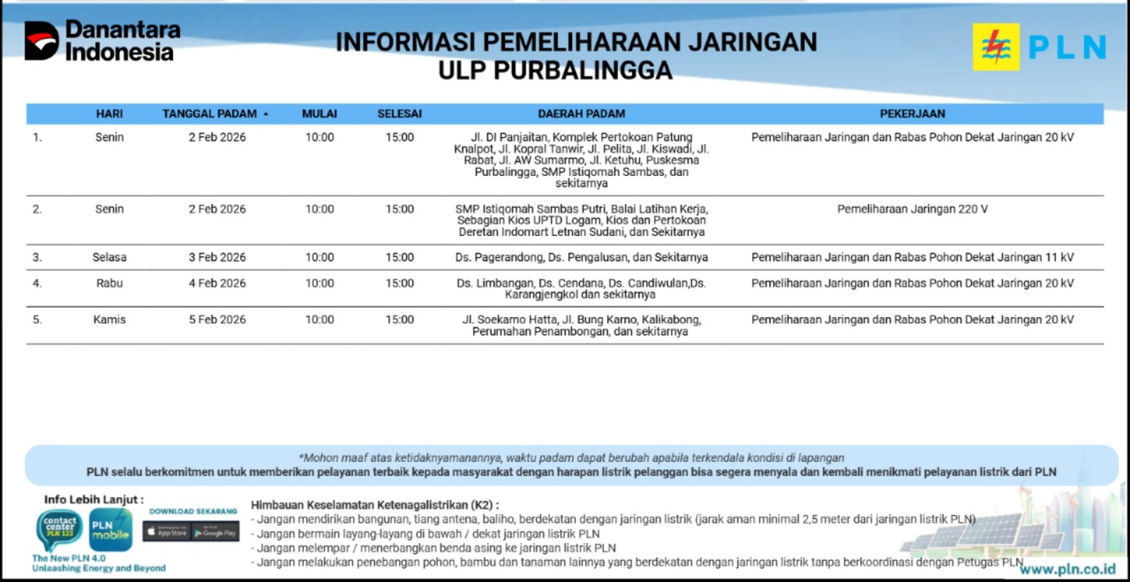 Pemadaman dilakukan mulai Senin hingga Kamis , 2–5 Februari 2026, seiring kegiatan pemeliharaan jaringan dan rabas pohon guna menjaga keandalan pasokan listrik di wilayah Purbalingga.